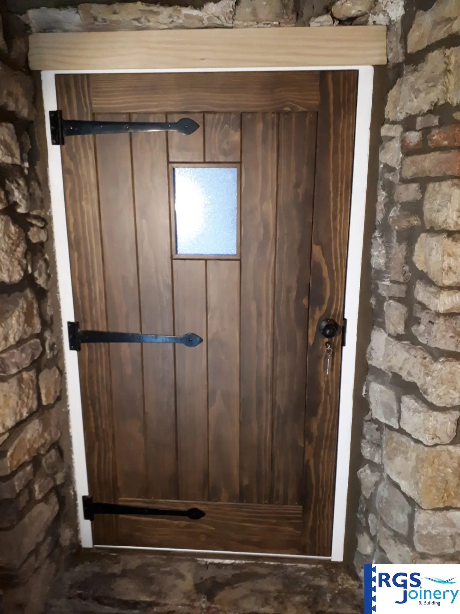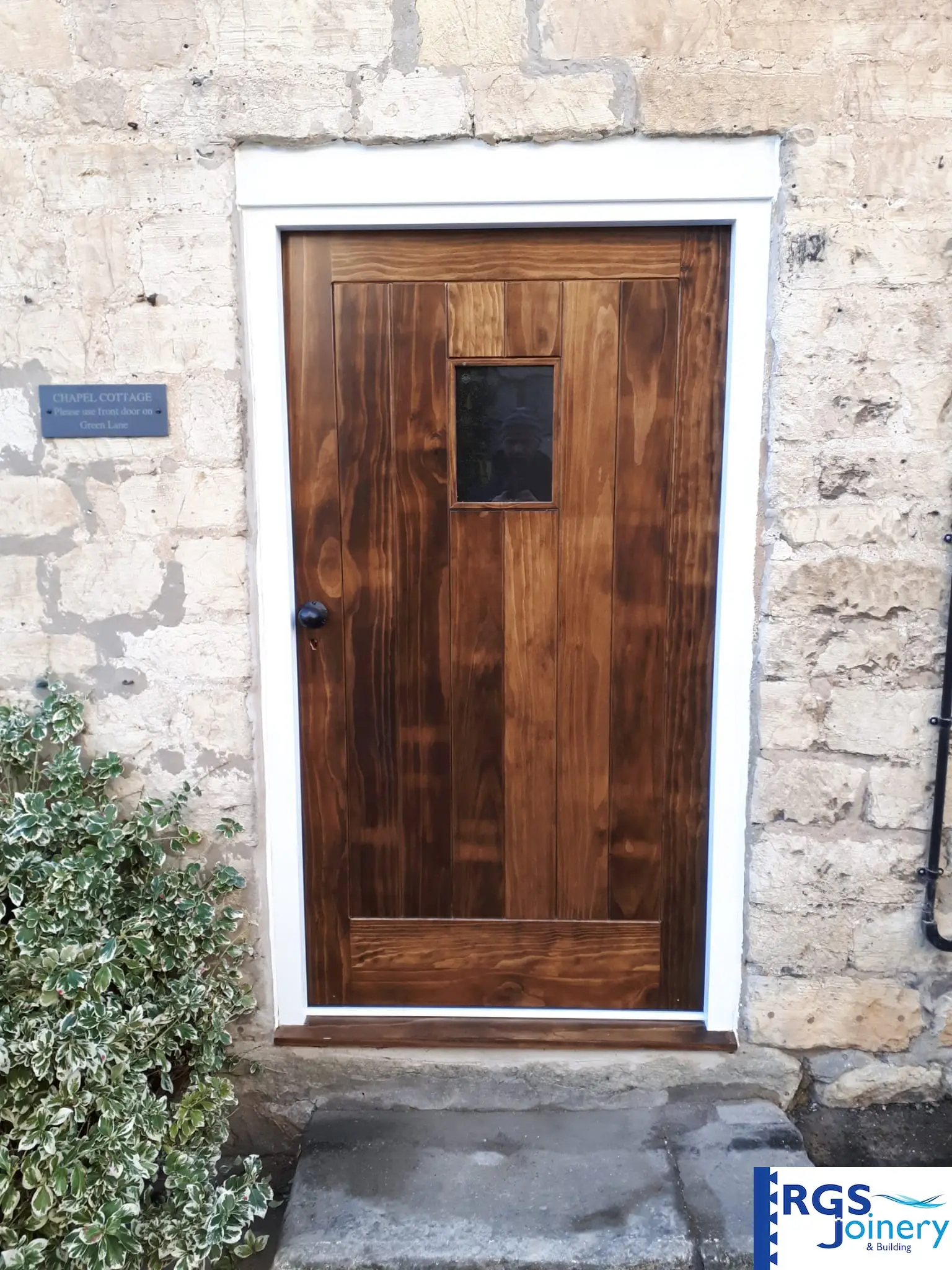 What a difference a new door can make! For this recent job, we replaced an old painted cottage door and frame with something more suited to the building. The new door is manufactured using beautiful Accoya hardwood, which is long-lasting and durable. The rustic fixtures finish it off nicely and make a really attractive new side entrance.