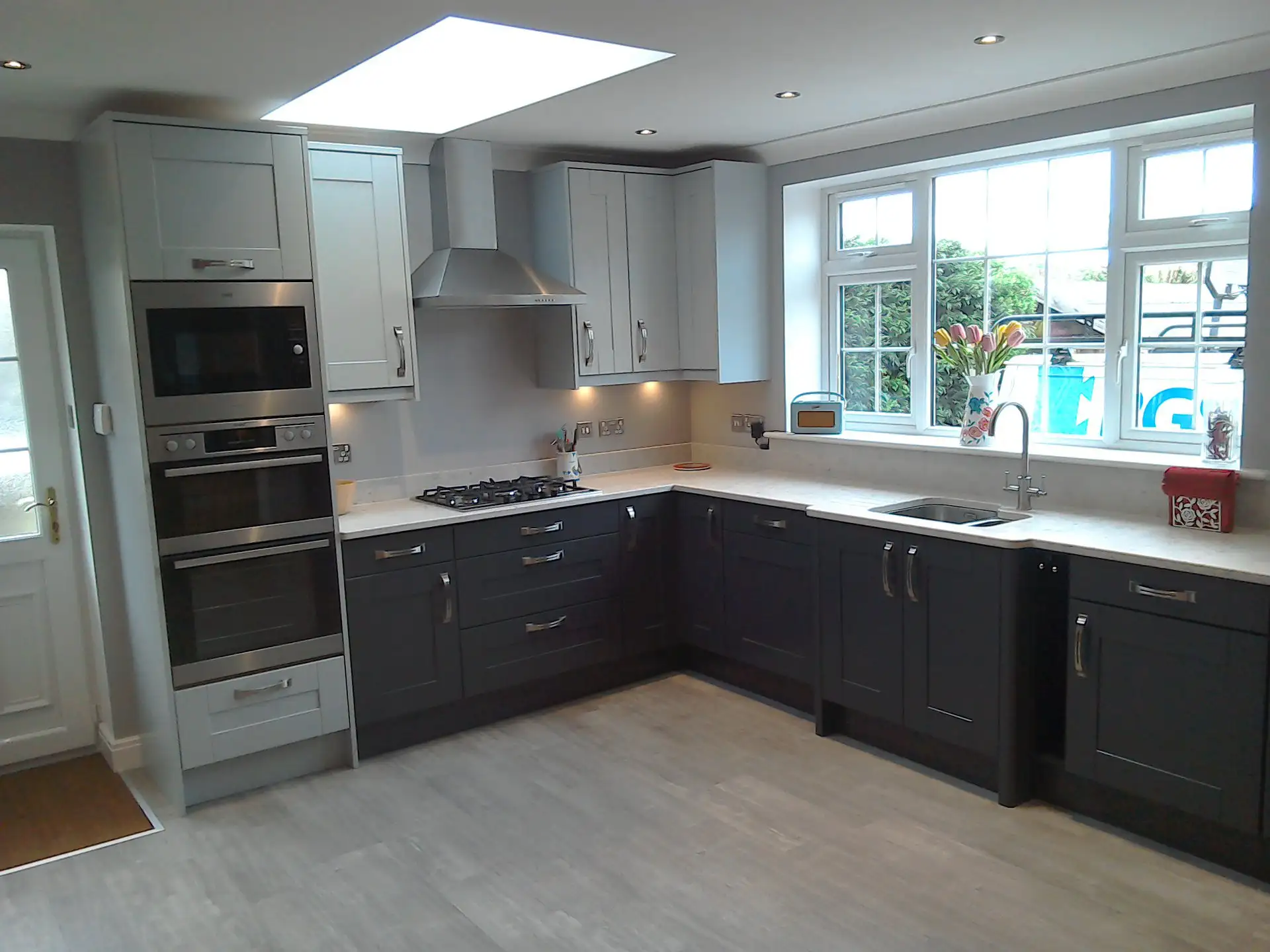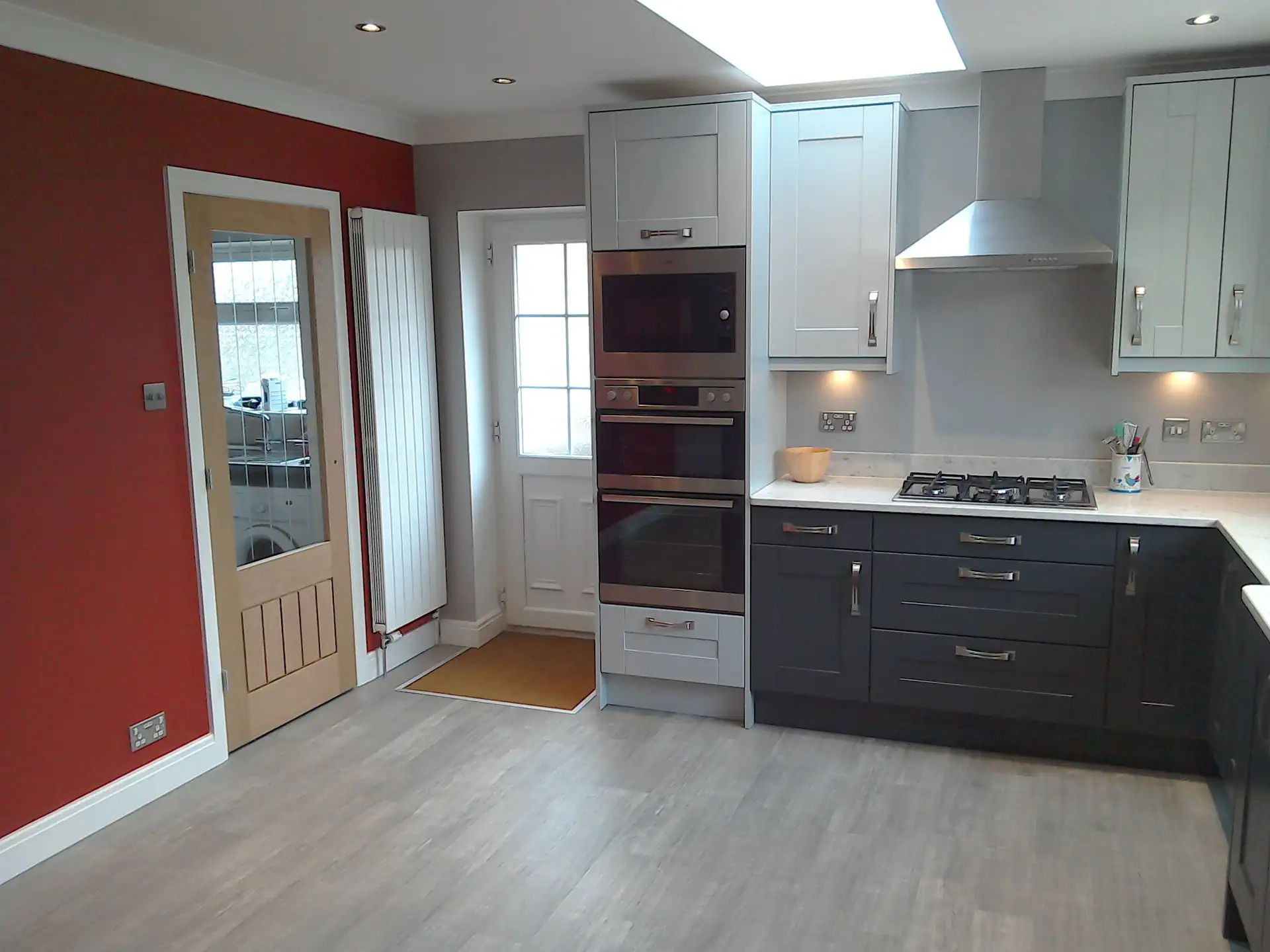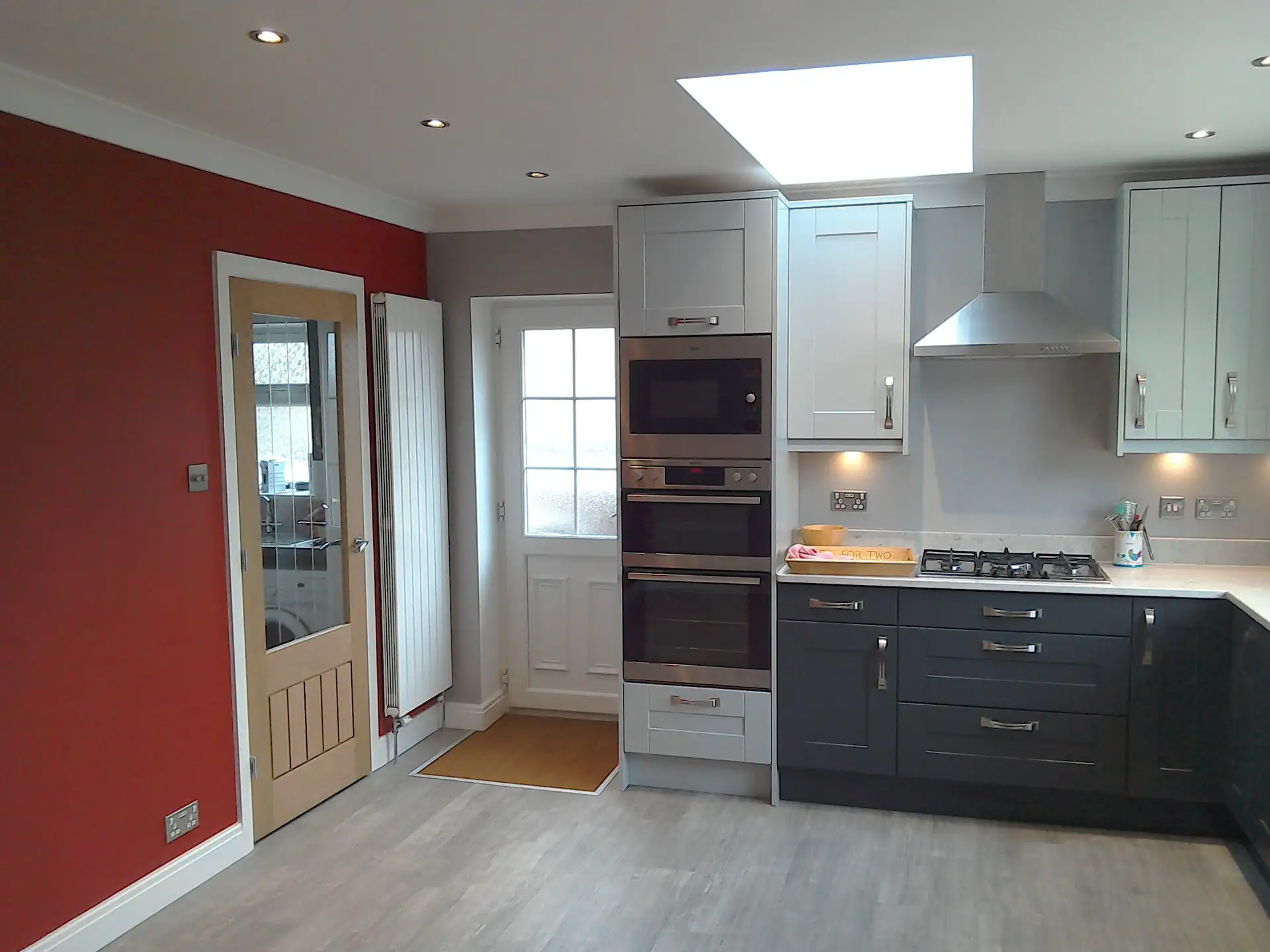 Building work to extend a kitchen by knocking through a bedroom and bathroom. Installing a Velux skylight. Then fitting a new painted Oak kitchen with Silestone Quartz worktop's.