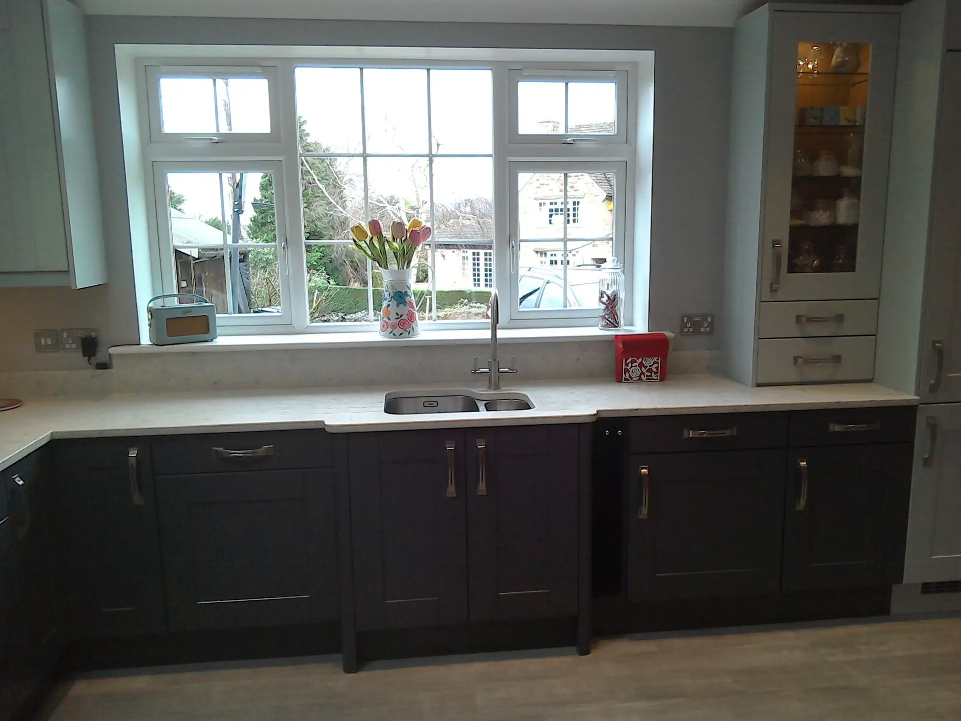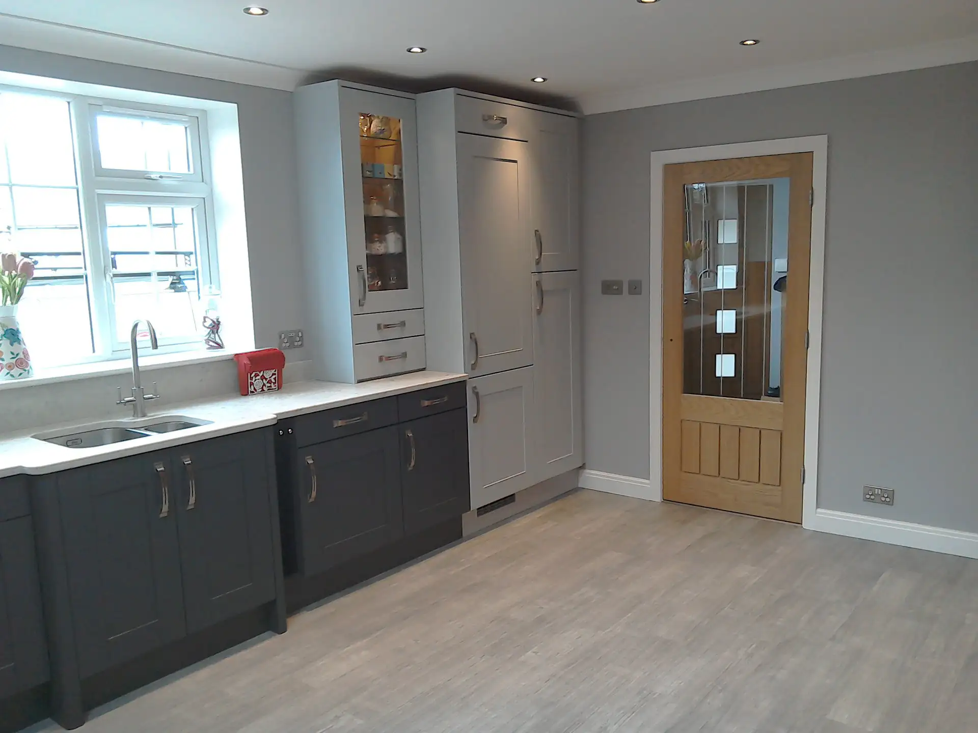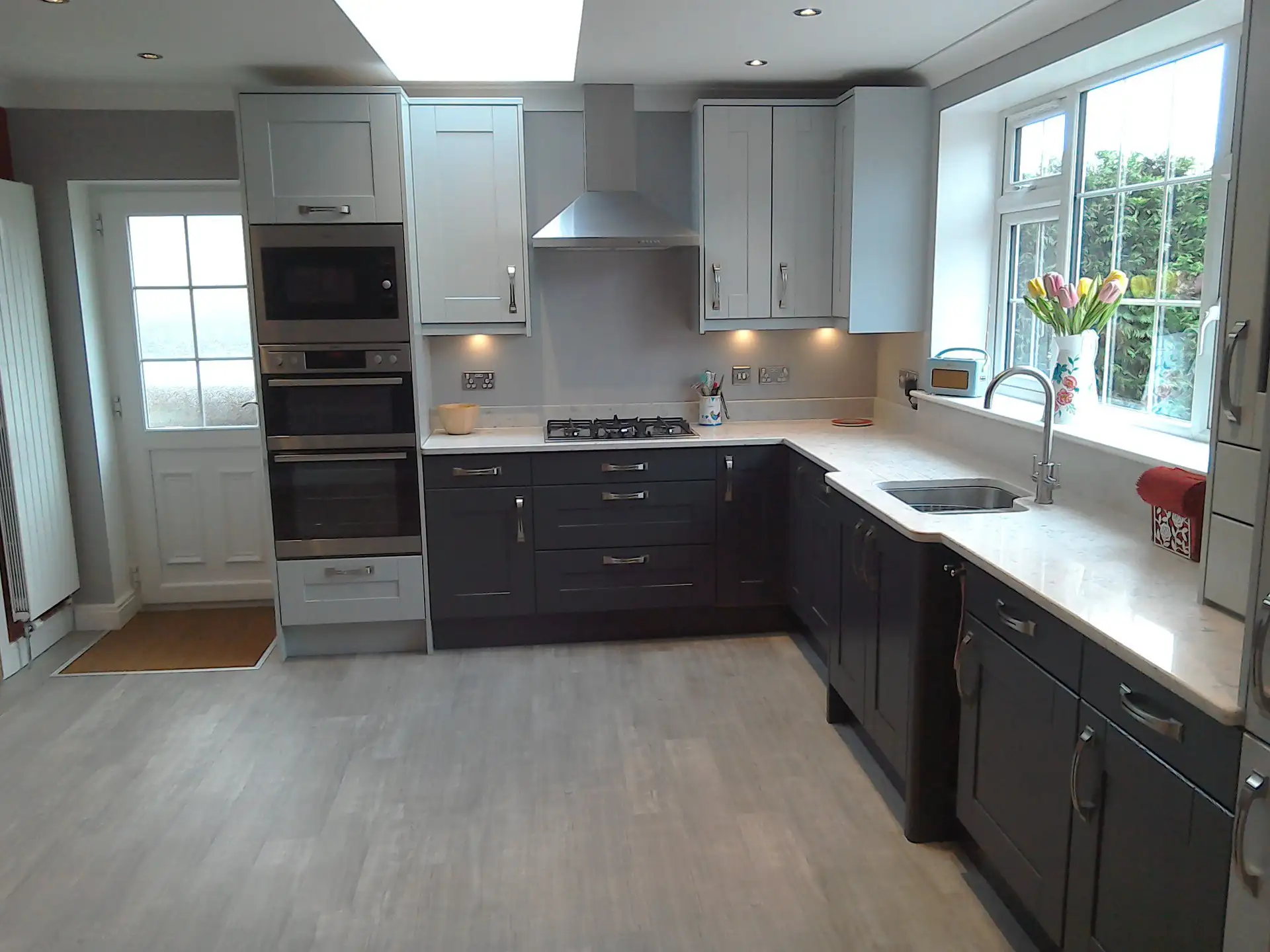 Building work to extend a kitchen by knocking through a bedroom and bathroom. Installing a Velux skylight. Then fitting a new painted Oak kitchen with Silestone Quartz worktop's.